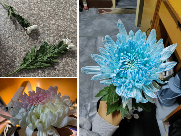 走进实验室,同学们好奇地打量着教授准备好的实验材料们——一簇簇紧挨着的白菊花、造型奇特的园艺剪、手术刀、食用色素……秋日阳光撒进实验室,落在一桶桶白色菊花上,冷秋与暖阳奇异融合在一起。