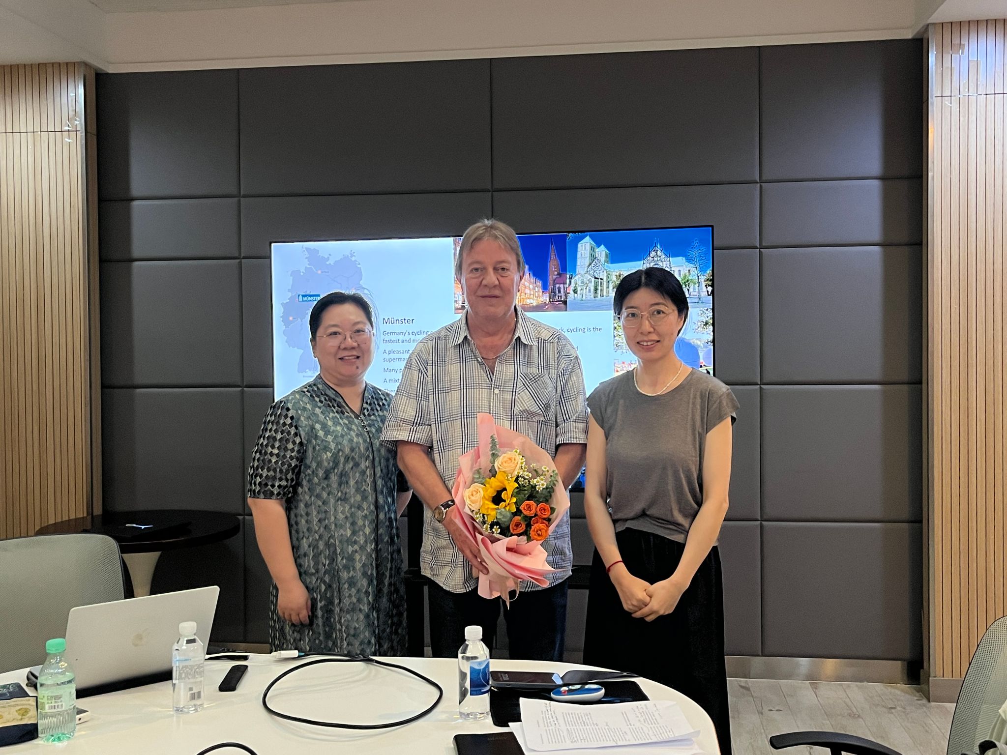 Jörg Kudla教授热情地向大家打了招呼,表明自己的喜悦心情。刘园园老师和何琳燕教授代表同学们一齐向Jörg Kudla教授献上花束,表达了大家对他的尊敬与欢迎。