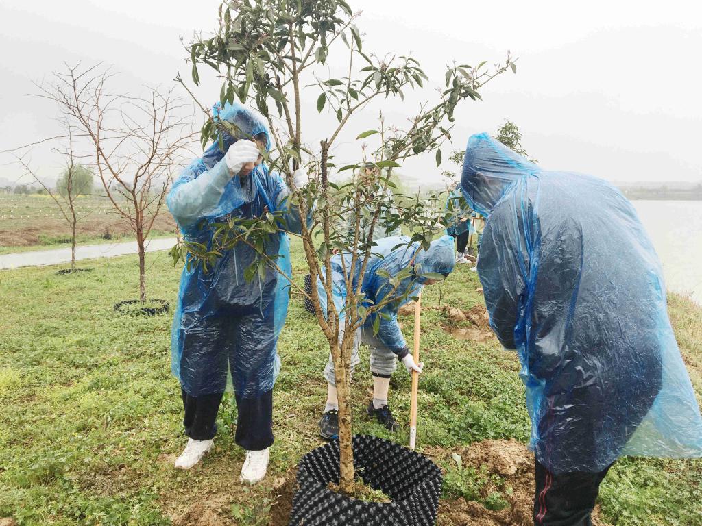 尽管风雨习习,但是白马基地的野老鹤草和灌木散发着香气,冲散了又闷又湿的凉意。同学们来到基地水库旁边的土堤坝上,负责白马基地教学与生产管理的老师和工人进行了现场指导,随后,同学们迅速分组,按照指导,有序地挥锹铲土、扶树填坑、提桶浇水,一排排栽好的树苗错落成行。同学们各自在自己所种植的桂花树上挂上牌子,在班级留念牌前合影留念,邀约秋天再来寻找自己种的桂树花香。一句句美妙的词句“丹桂香十里,南农丰百年”“稚花细蕊藏叶中,木樨桂香绕枝上”“今朝阳春白马植月桂,他年素秋凌霄折桂枝”“花不能言,馥郁满城”,寄托着同学们对生活和学业、南农和班级的美好期望。